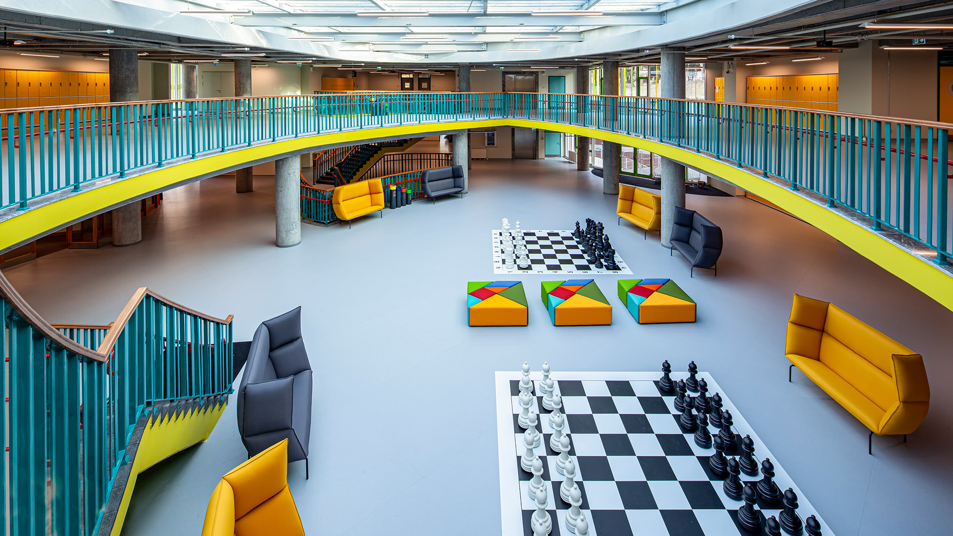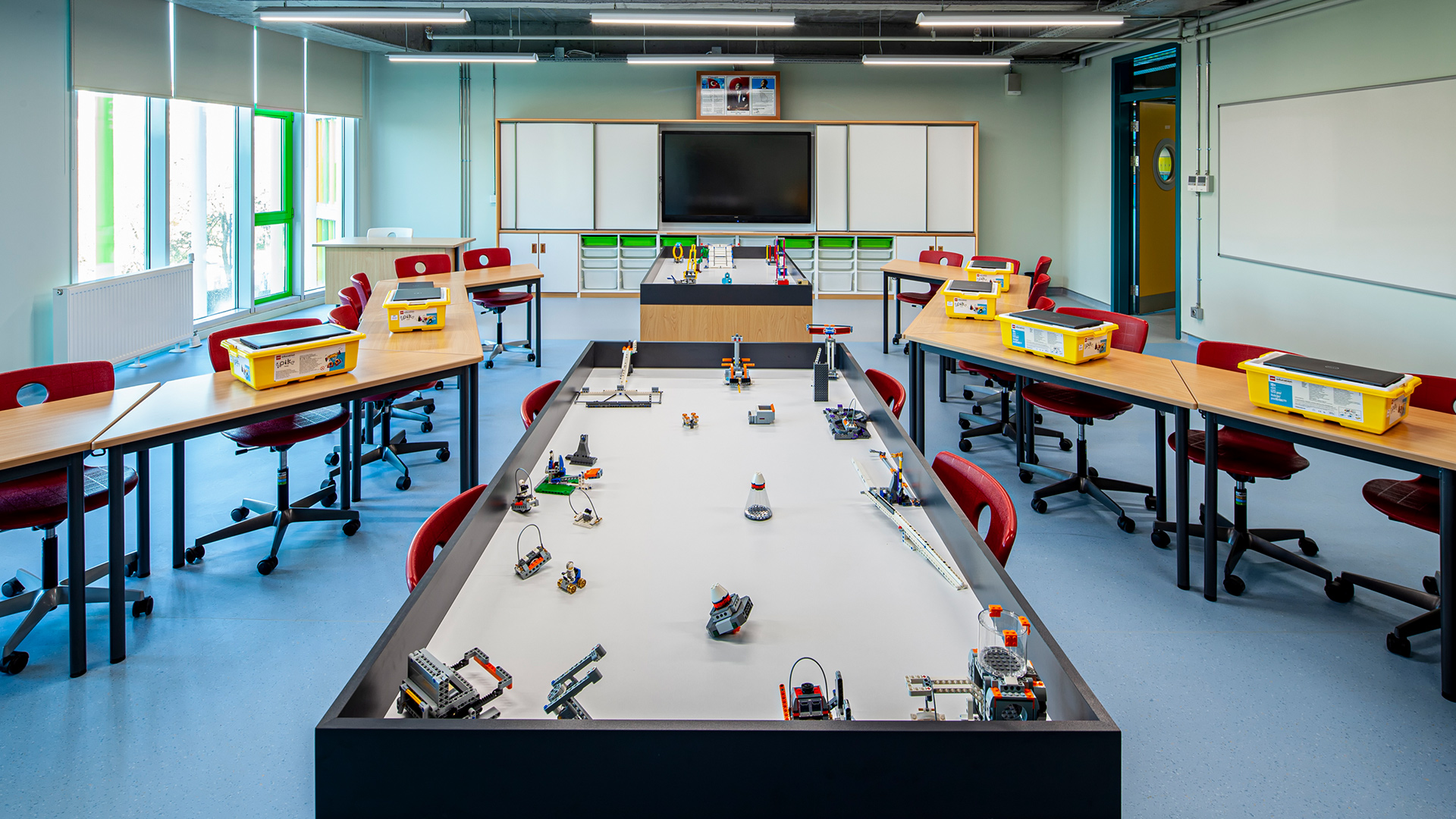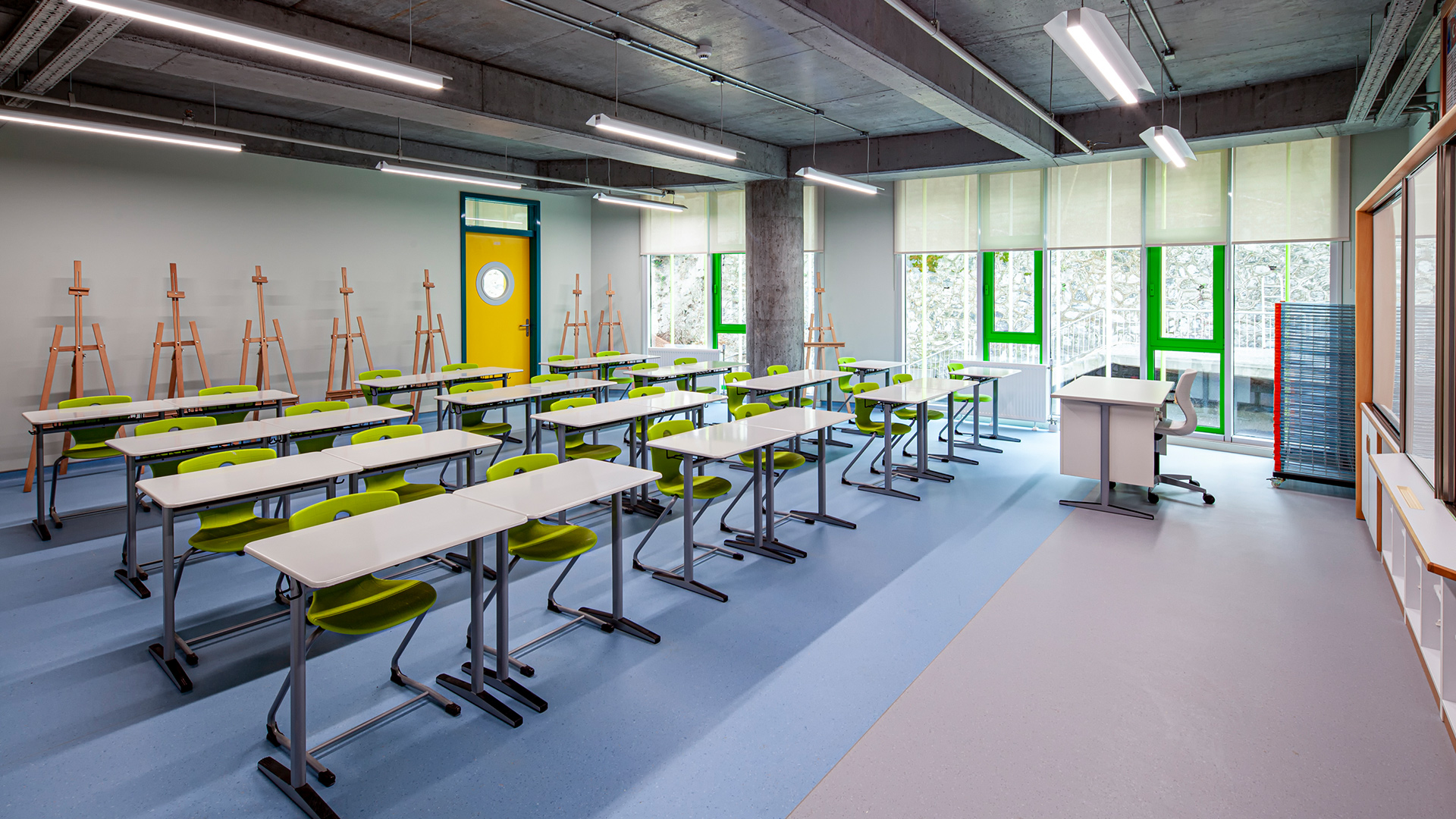 Sosyal ve fen bilimlerine ait öğrenme alanları aynı katta bulunuyor ve hem yatayda hem dikeyde ortak bir topluluk alanını paylaşıyor. Matematik, fen, teknoloji için birer öğrenme alanı var, 3-boyutlu sanatlar dahil her türlü sanatların yapılabileceği alanlar var. Bir tasarım ve teknoloji alanı var, lisan öğrenmeye uygun alanlar var, müzik alanları, dans stüdyoları... Okulun genelinde 21. yüzyıl becerilerinin hâkim olduğu bir ortam oluşacak, özellikle sosyal, sanat ve fen konularının kesişmesine, buluşmasına izin verilecek. Tüm mobilyaların hareketli olması da bizce çok önemli, her alan istendiğinde kolayca başka bir fonksiyona dönüştürülebilecek. Teknoloji ise tümüyle binaya entegre olmalı, çevrenin doğal bir parçası olmalı, aletleri taşımak, fiş takıp çıkarmak zorunda kalınmamalı. Ayrıca, binanın içinde bile geniş yeşil alanlar var.